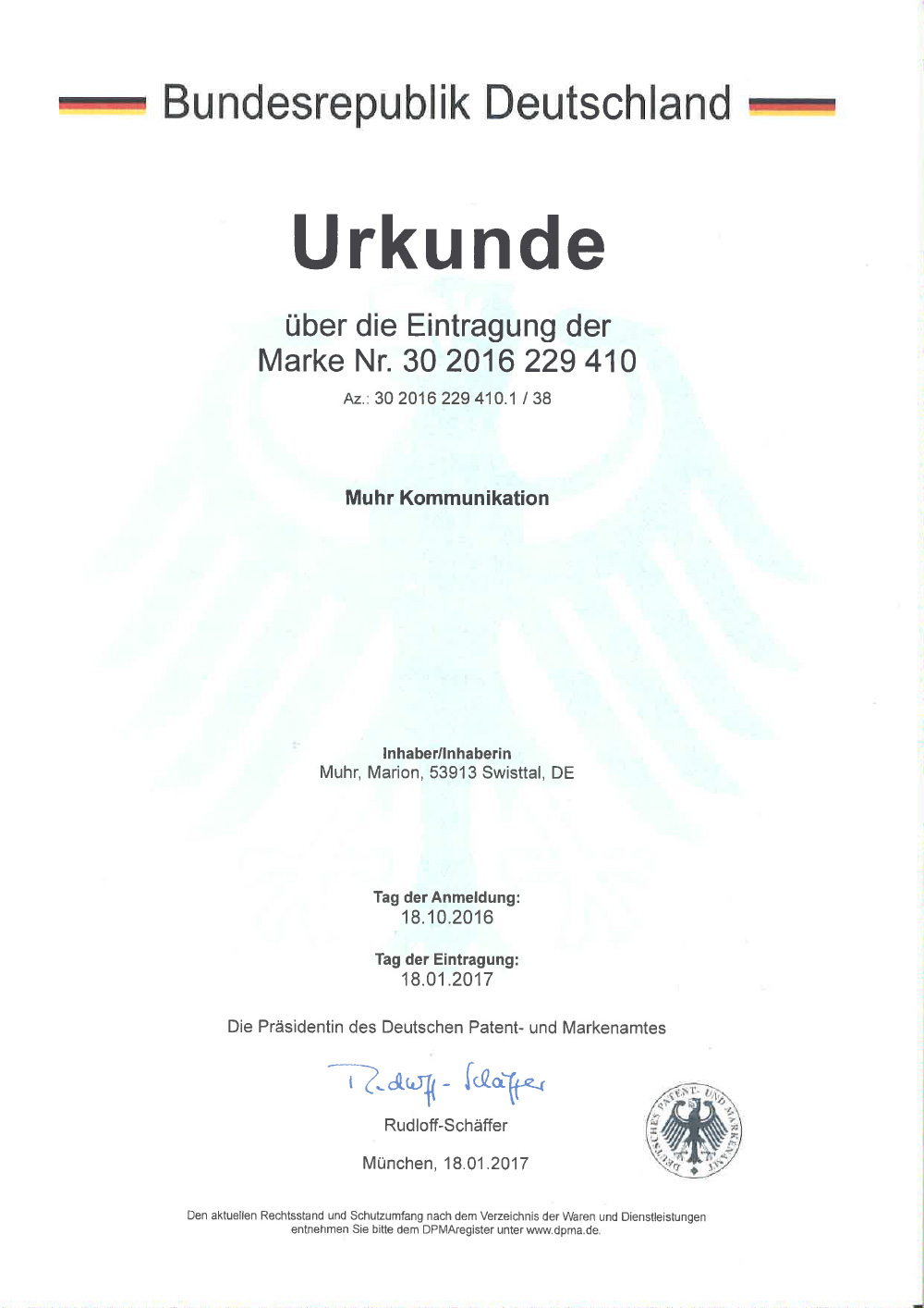 Dt. Patent- und Markenamt, München, Bundesrepublik Deutschland. (Wort- und Bildmarke).